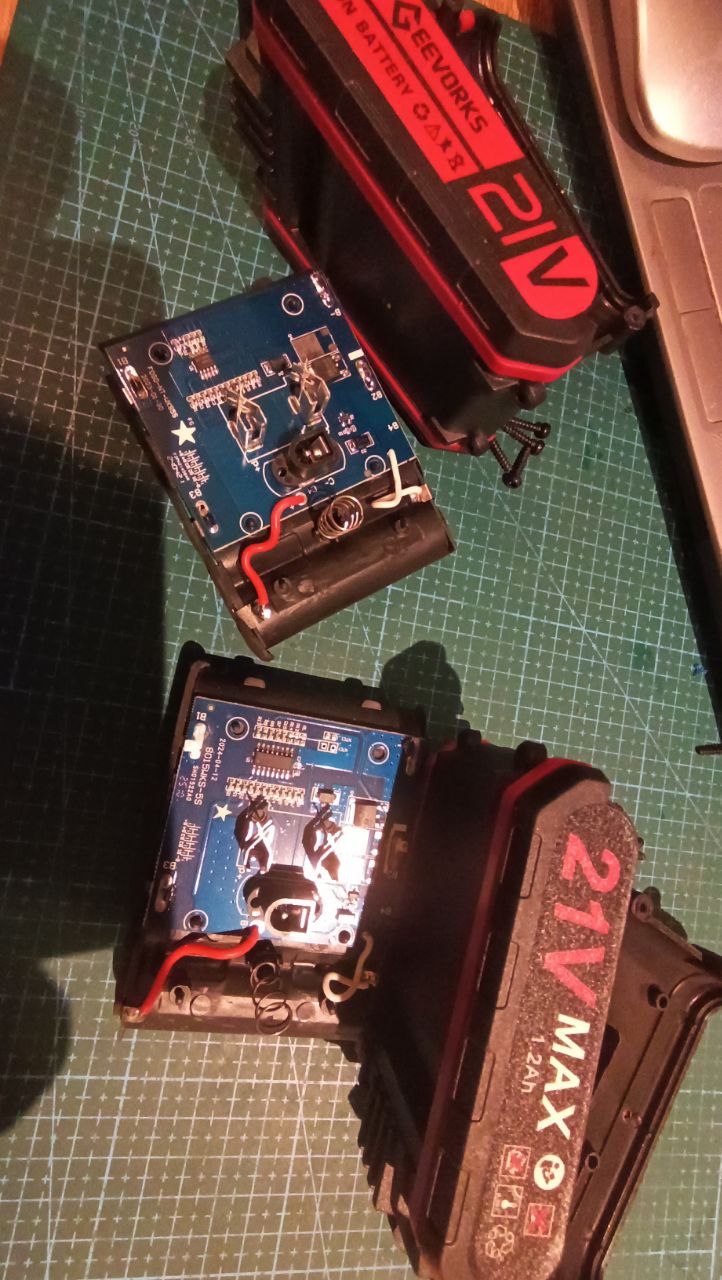 Зарядку тоже дали, но на 5 В выходного. А аккумы "на 21 В". Но судя по банкам и встроенной плате на 18.