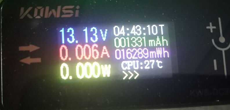 Зарядка продолжалась. Наконец почти через 5 часов при напряжении аккумулятора 12.68 в и емкости 1315mAh зарядка остановилась.