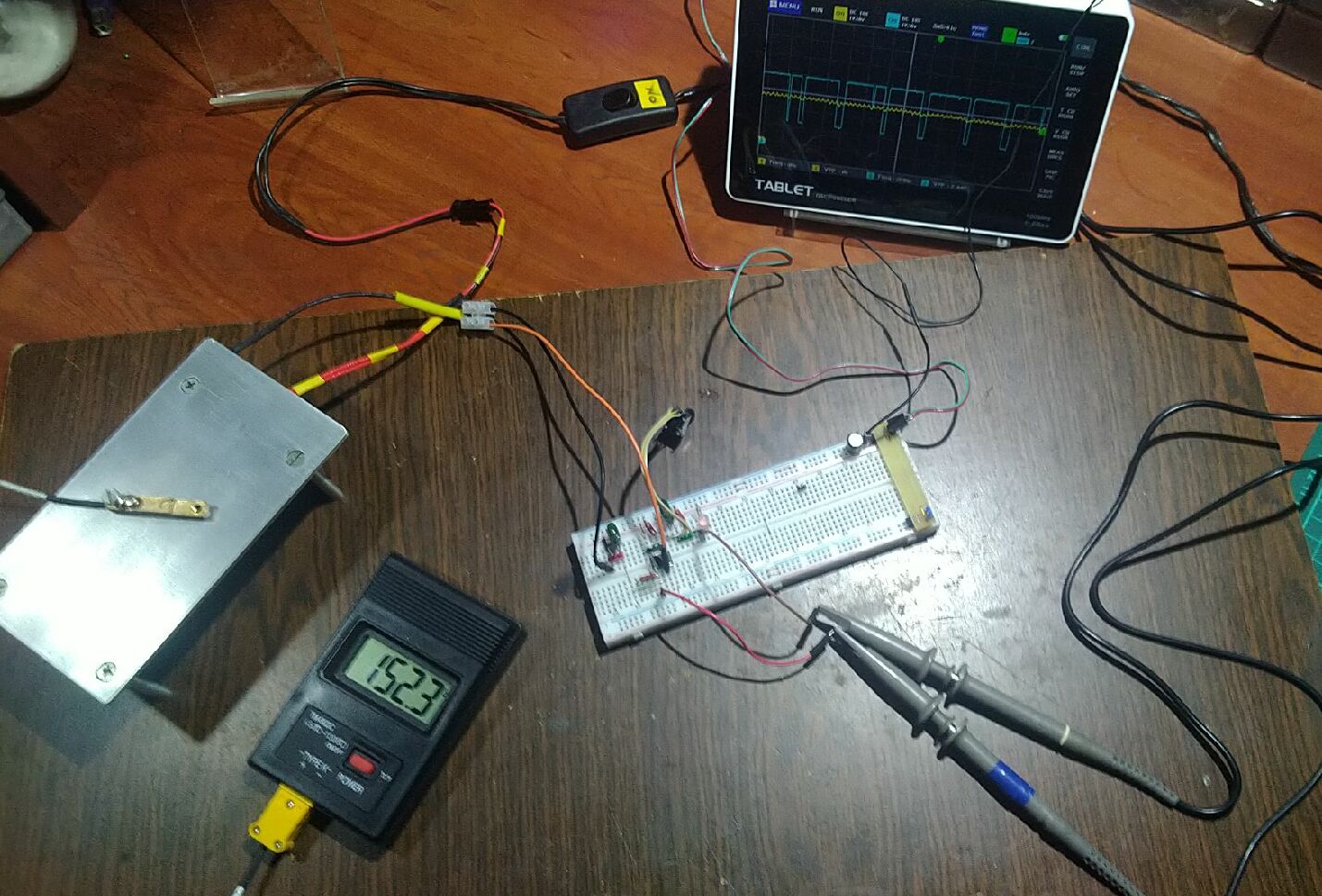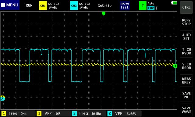 Желтый луч - это термопара. Голубой – выход компаратора на регулятор. Почему-то термопара какой-то волной отображается. Может наводки на провод? Но работе это не мешает. В общем как-то так….