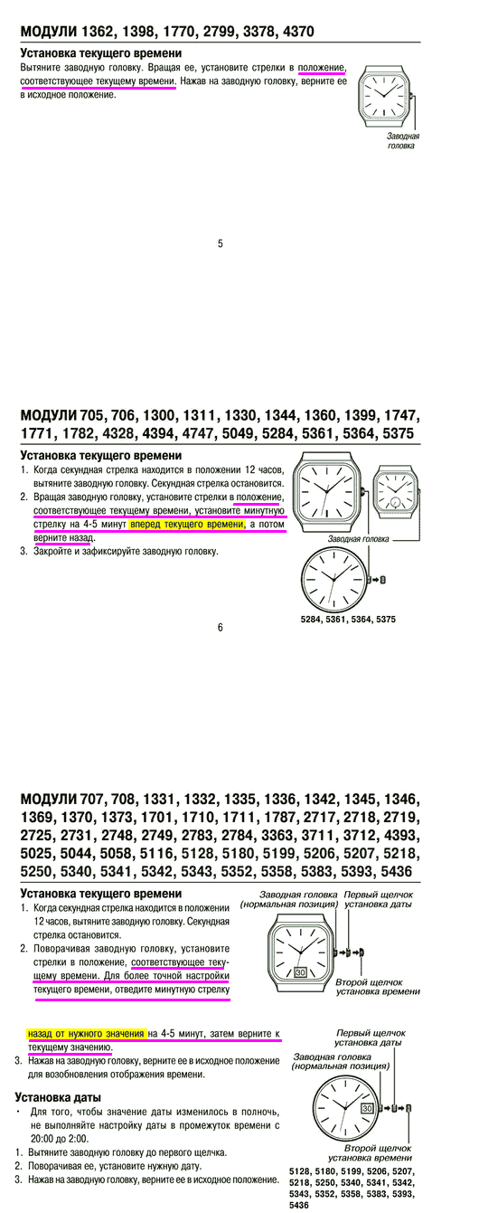 Это инструкция, общая для нескольких (довольно многих) моделей механизма. Принципиально тут 3 варианта: часы без секундной стрелки, часы с секундной стрелкой, часы с секундной стрелкой и календарем.