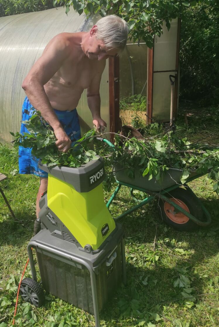 Хорошая машинка. Только я с зелеными листьями никогда не перерабатываю, накапливаю кучу, жду немного, а потом ветки перекручиваю в отличную сухую мульчу.