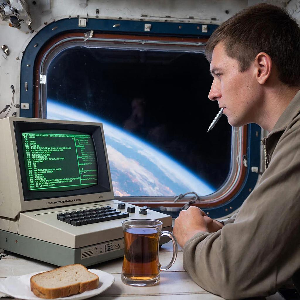 Рабочий стол с Электроникой-60 перед иллюминатором орбитальной станции... В иллюминаторе - загнутый край Земли на черно-синем фоне...