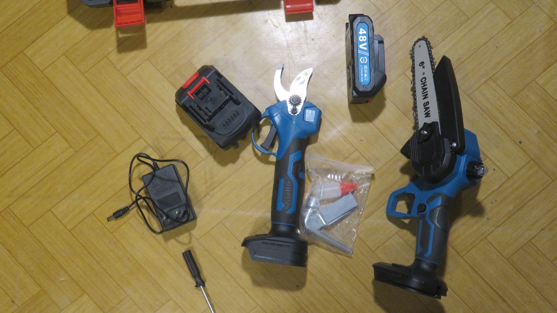 Я внимательно посмотрел и увидел в пиле щёточный мотор . Разобрал секатор - там моторчик бесщёточный. На аккумуляторах написано 48 V и 3,0 А . Оказалась туфта - 18 В. Аккумуляторы конечно слабенькие, но у меня есть значительно мощнее от большой пилы. Так что бедствовать не буду.
