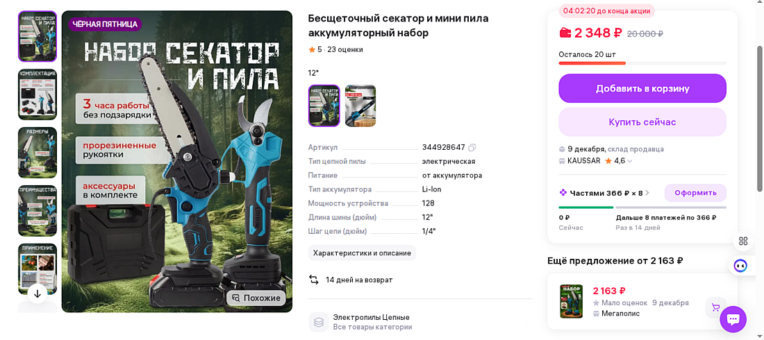 А теперь о грустном. В рекламе маркетплейса написано, что в наборе бесщёточный секатор и пила. Я внимательно посмотрел и увидел в пиле щёточный мотор