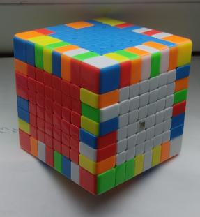 Проблема ориентации: У куба 8x8 нет фиксированного центрального элемента. Это значит, что цвета граней нужно расставлять строго по памяти (белый напротив желтого, синий напротив зеленого, красный напротив оранжевого, при этом если белый сверху, то красный должен быть перед вами, а синий — справа). На фото видно, что на одной грани смешаны белый, синий, красный и зеленый цвета.