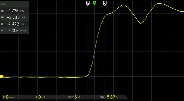 Покрутил крутилки, поднастроил и провел испытания. Больше всего меня интересовала скорость нарастания фронта импульса. Поэтому взял самое быстродействующее, что нашел у себя в коробочках – это микруха CD74ACT86. В справочнике указана скорость нарастания 3,7-14 ns. У меня получилось 4,5 ns. Экспериментом остался доволен. Щуп признал годным!