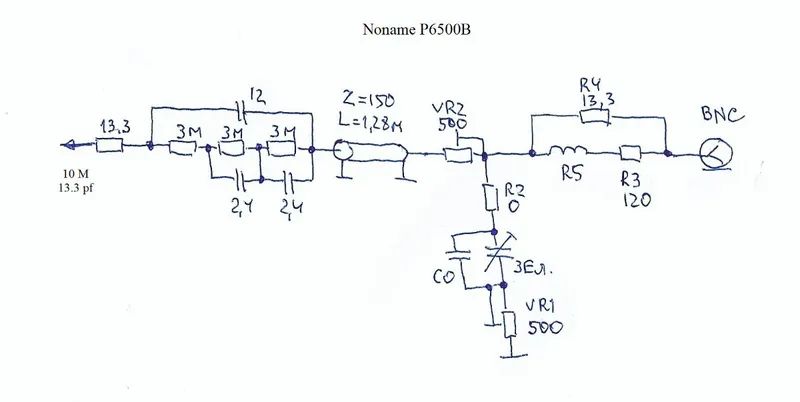 Вместо резистора R1 стоит перемычка. В целом схема моего щупа Р6100 выглядит так: