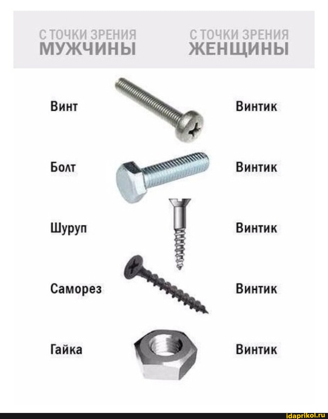 Да хрен с ними, с болтами и винтами. Я зацепился за то, что у него шуруп и винт одно и то же. Или вы тоже так считаете?!