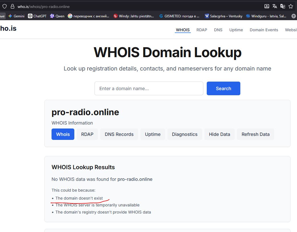 https://who.is/whois/pro-radio.online покажет, активен ли домен, у кого зарегистрирован и когда истекает.