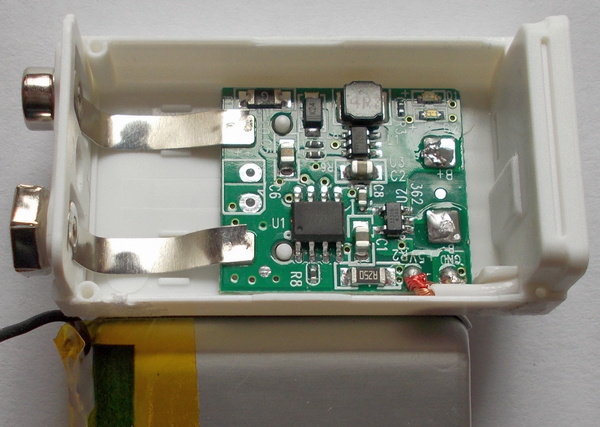 Вот платка зарядки, защиты и преобразователя из тех моих. Как видно можно легко добавить по выходу LC фильтр на smd компонентах, тем более, что преобразователь работает на 1,2 МГц. Аккум имеет ёмкость 1200 мА/ч. Посмотрим что запихали в эти...